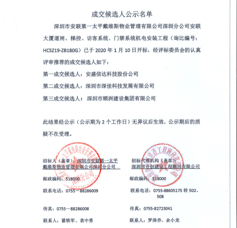 深圳市安聯(lián)第一太平戴維斯物業(yè)公司深圳分公司深圳安聯(lián)大廈道閘系統成交候選人公示名單