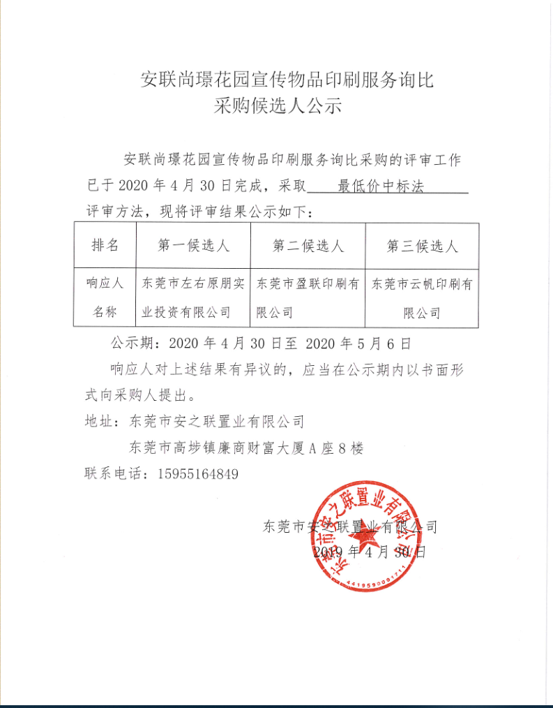 安聯(lián)尚璟花園宣傳用品印刷服務(wù)采購詢(xún)比候選人公示